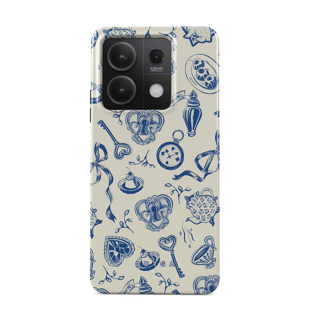 此設計特色: 茶杯、茶壺、懷錶、鑰匙、紅心、陶瓷、藍白圖案