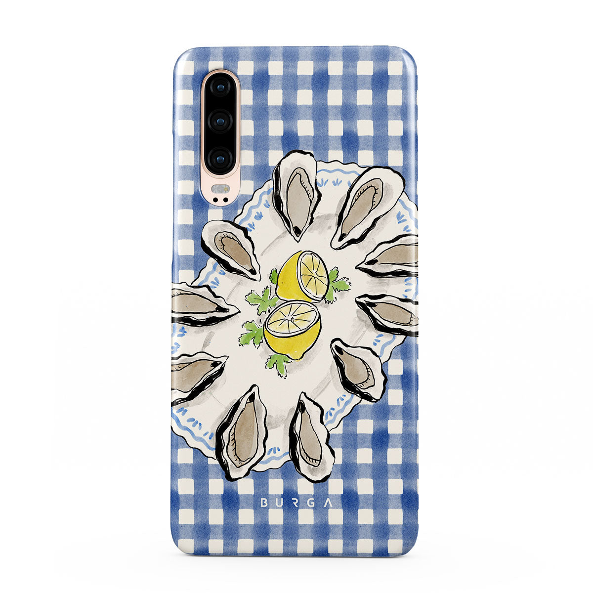 此設計特色:牡蠣、檸檬、藍色格子圖案、新鮮海岸元素、柔和的粉彩色調