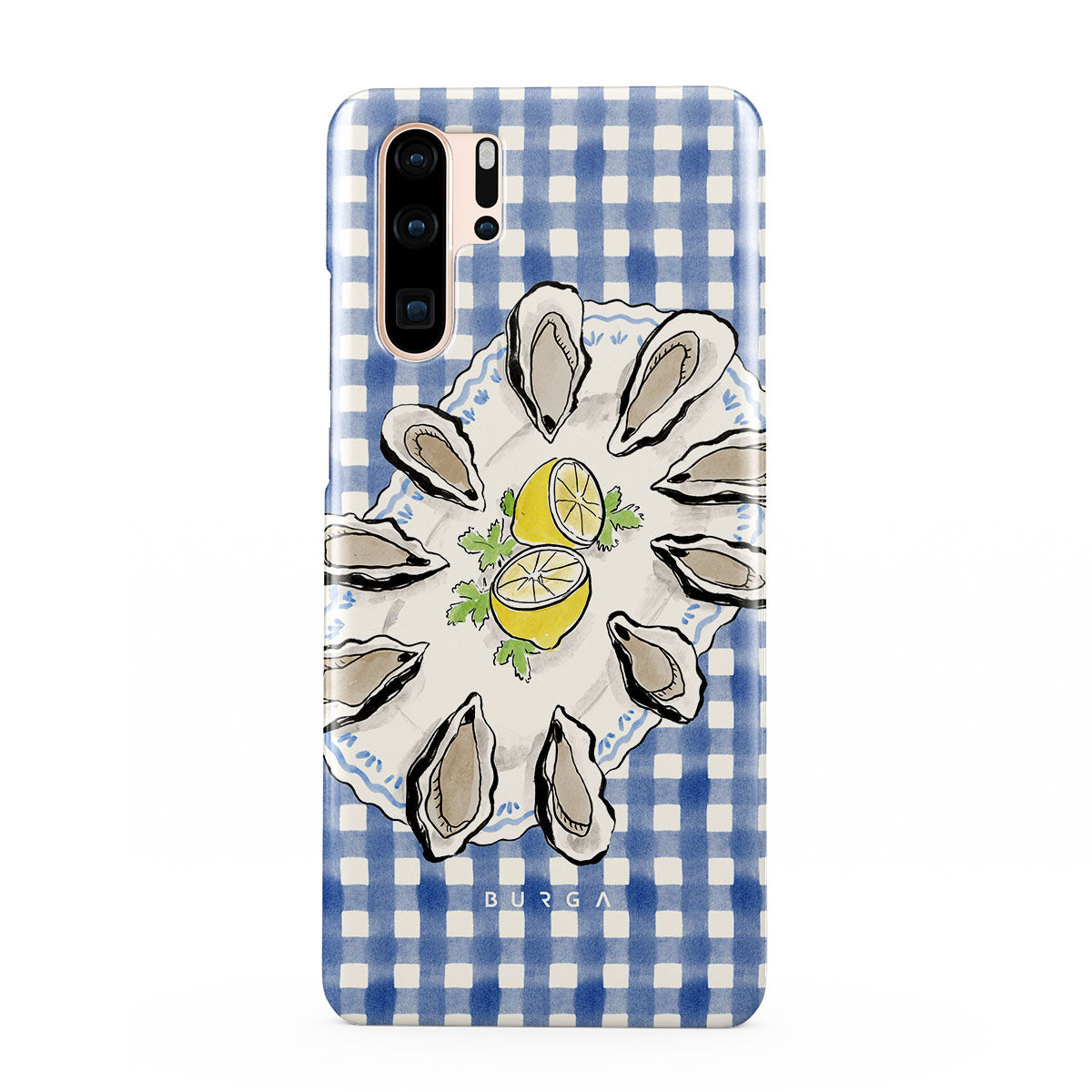 此設計特色:牡蠣、檸檬、藍色格子圖案、新鮮海岸元素、柔和的粉彩色調