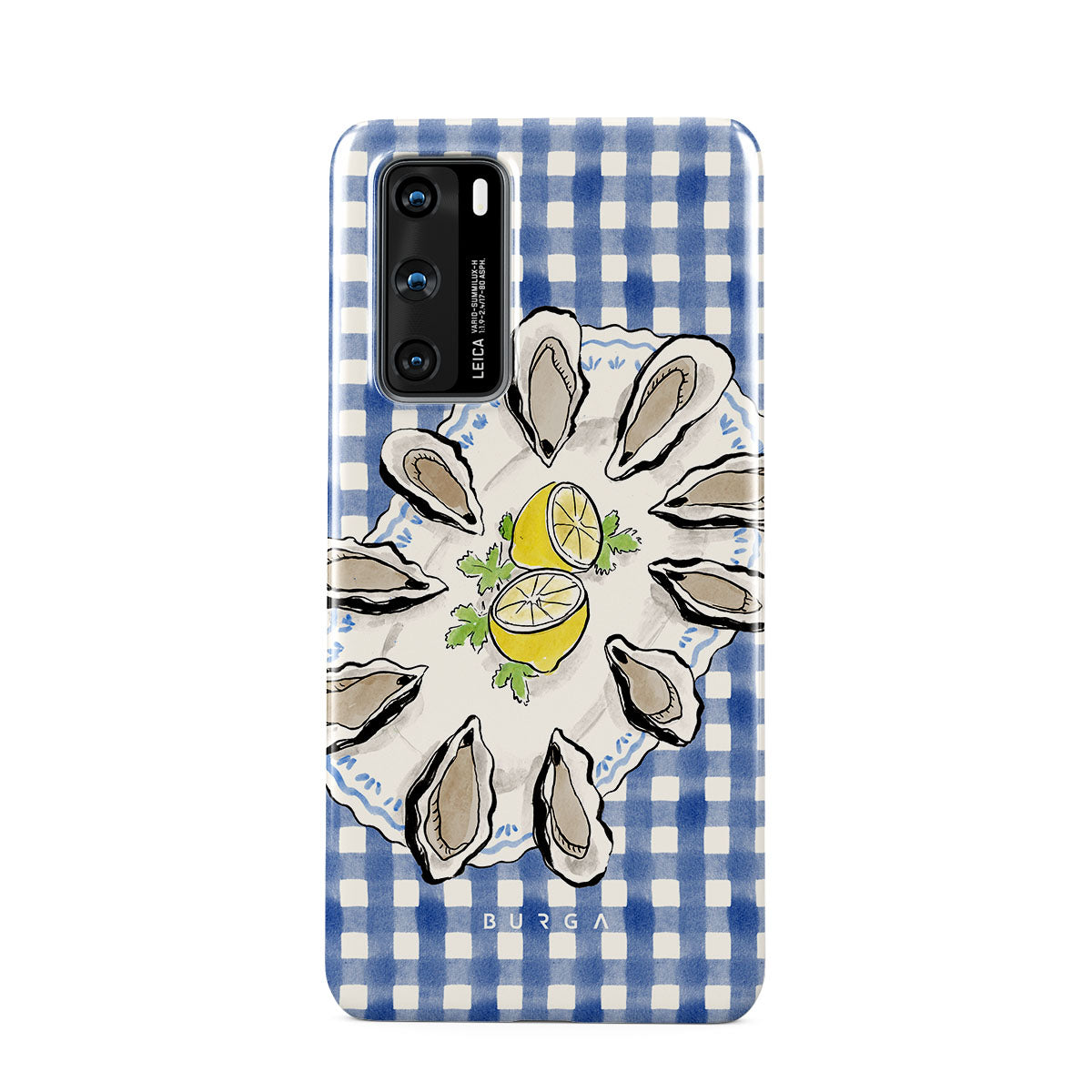 此設計特色:牡蠣、檸檬、藍色格子圖案、新鮮海岸元素、柔和的粉彩色調