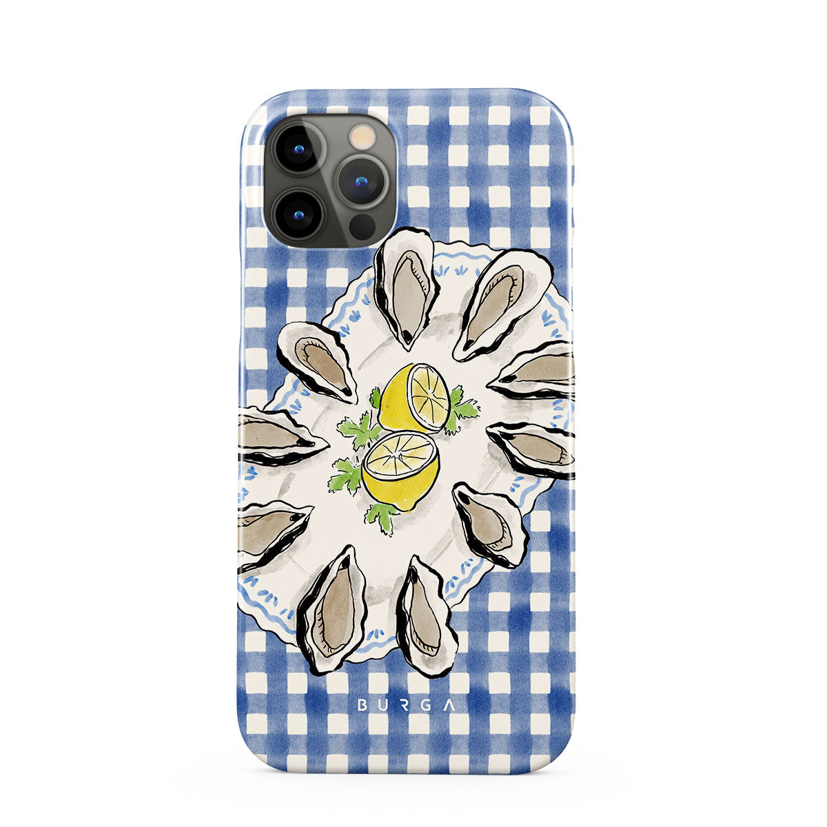 此設計特色:牡蠣、檸檬、藍色格子圖案、新鮮海岸元素、柔和的粉彩色調