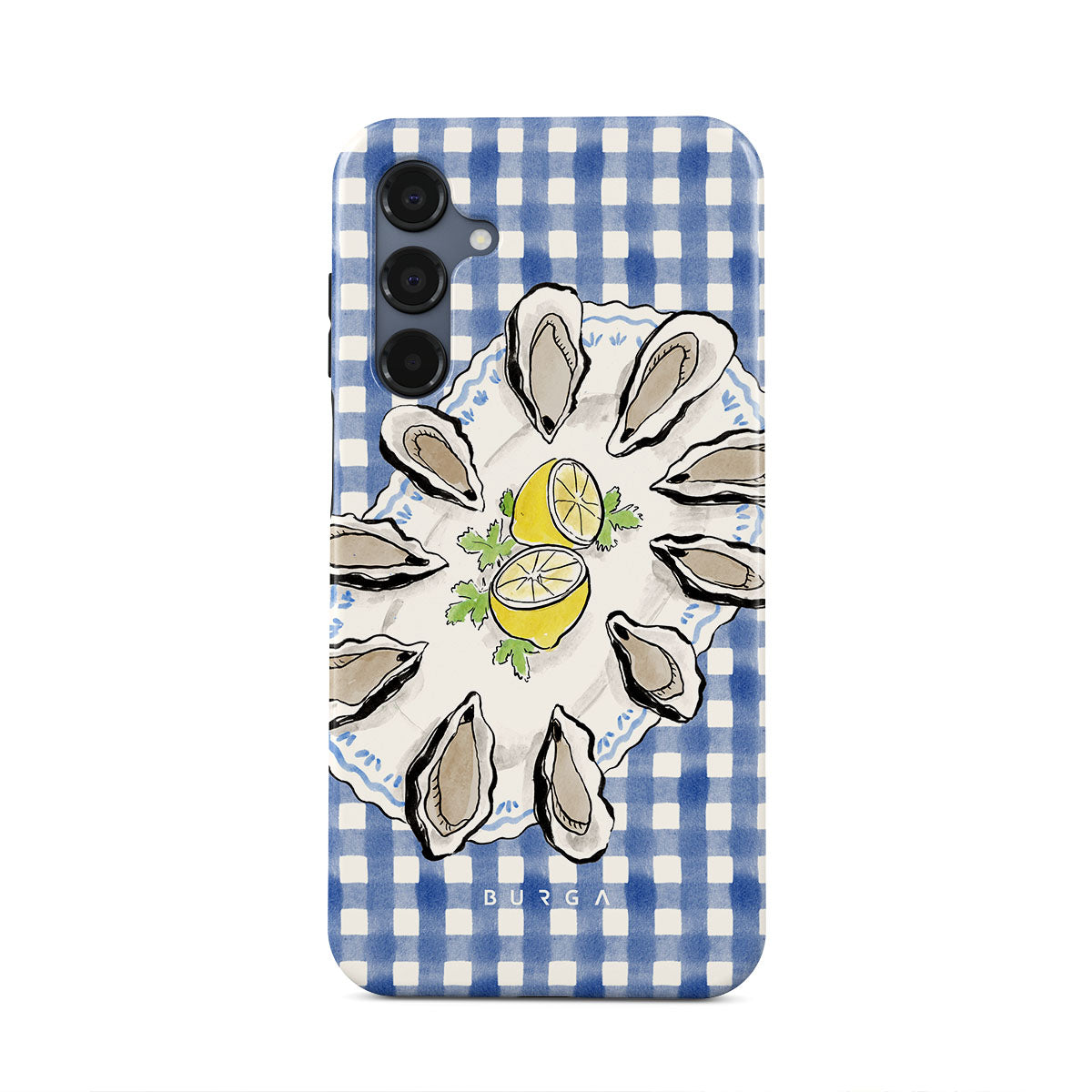 此設計特色:牡蠣、檸檬、藍色格子圖案、新鮮海岸元素、柔和的粉彩色調