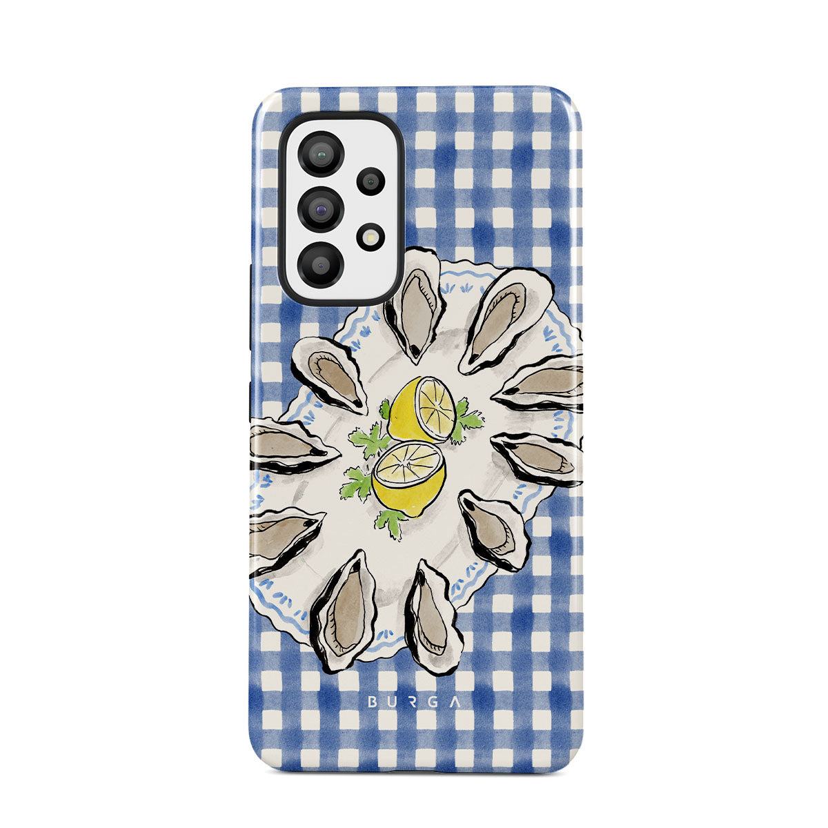 此設計特色:牡蠣、檸檬、藍色格子圖案、新鮮海岸元素、柔和的粉彩色調