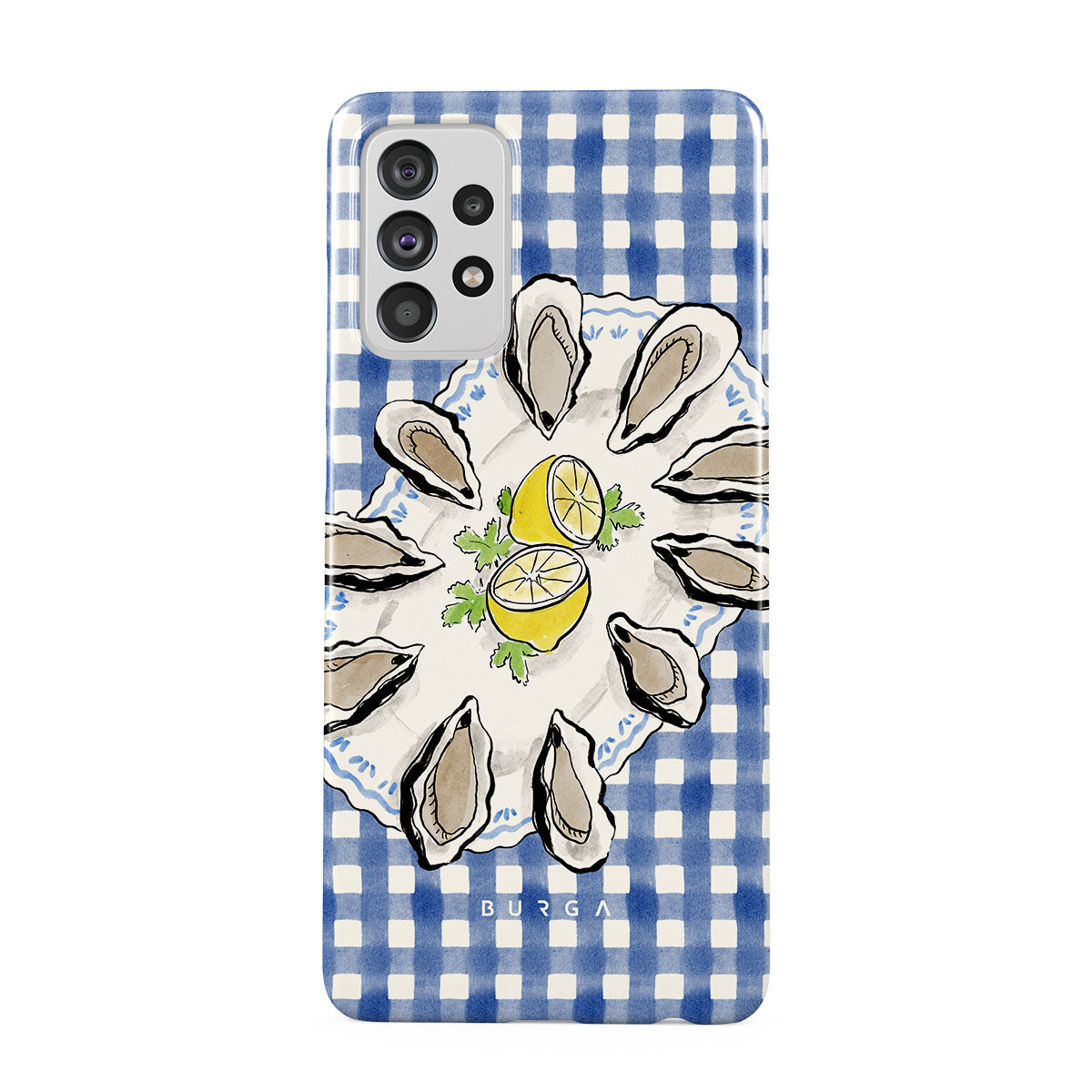此設計特色:牡蠣、檸檬、藍色格子圖案、新鮮海岸元素、柔和的粉彩色調