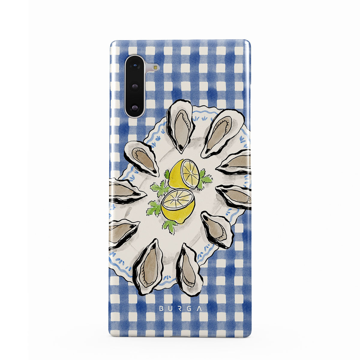 此設計特色:牡蠣、檸檬、藍色格子圖案、新鮮海岸元素、柔和的粉彩色調