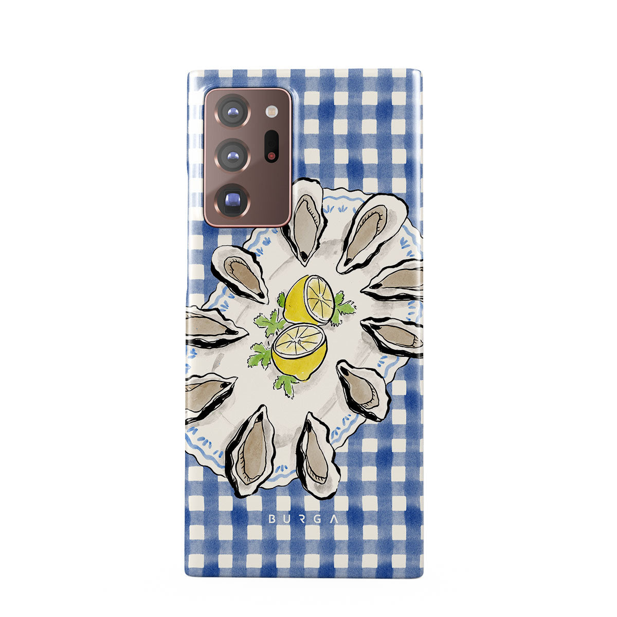 此設計特色:牡蠣、檸檬、藍色格子圖案、新鮮海岸元素、柔和的粉彩色調