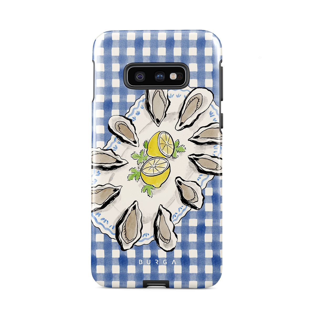 此設計特色:牡蠣、檸檬、藍色格子圖案、新鮮海岸元素、柔和的粉彩色調