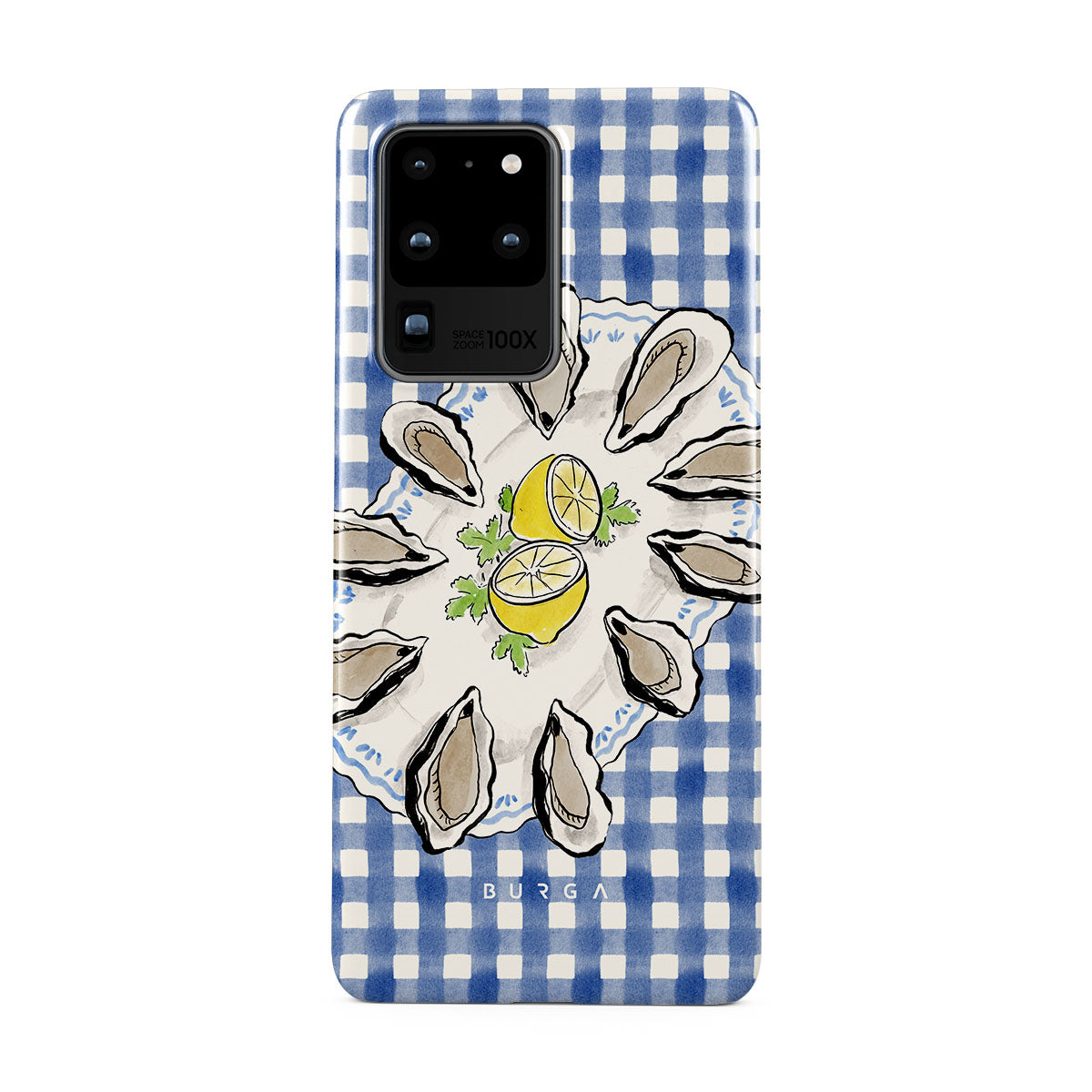 此設計特色:牡蠣、檸檬、藍色格子圖案、新鮮海岸元素、柔和的粉彩色調