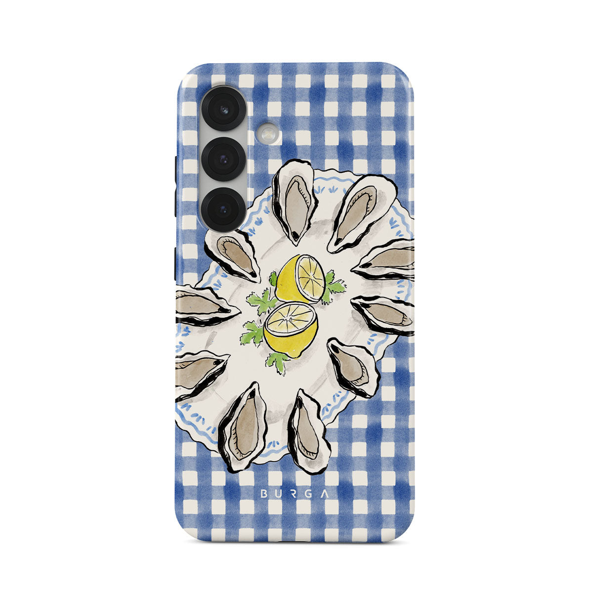 此設計特色:牡蠣、檸檬、藍色格子圖案、新鮮海岸元素、柔和的粉彩色調