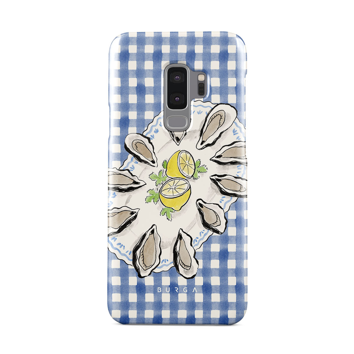 此設計特色:牡蠣、檸檬、藍色格子圖案、新鮮海岸元素、柔和的粉彩色調