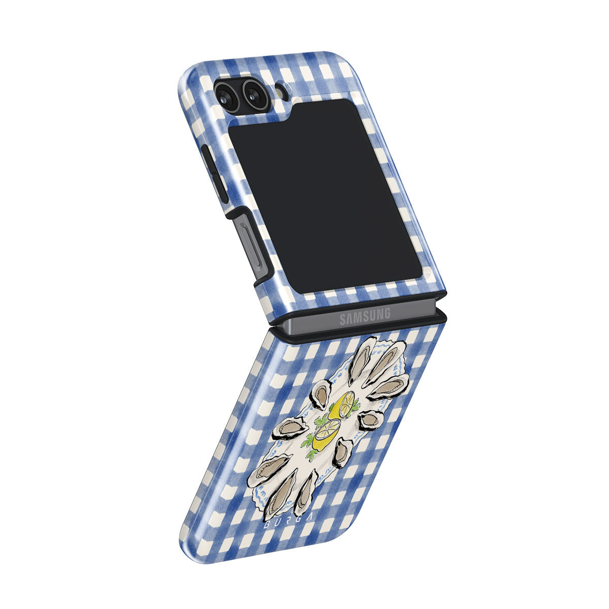 此設計特色:牡蠣、檸檬、藍色格子圖案、新鮮海岸元素、柔和的粉彩色調