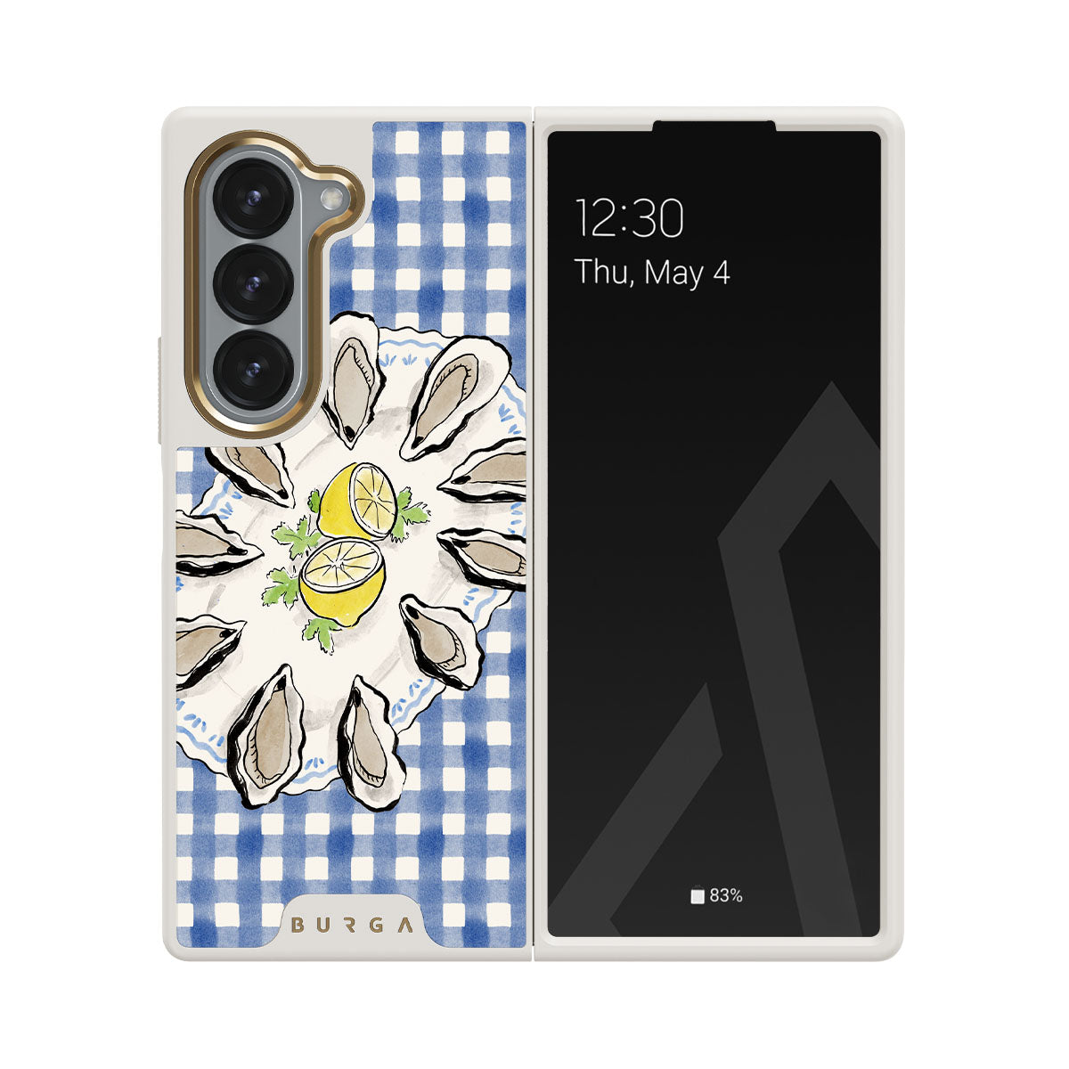 此設計特色:牡蠣、檸檬、藍色格子圖案、新鮮海岸元素、柔和的粉彩色調