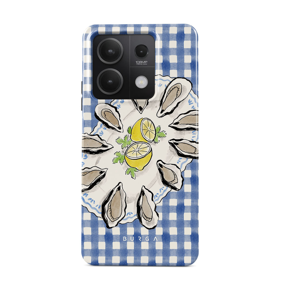 此設計特色:牡蠣、檸檬、藍色格子圖案、新鮮海岸元素、柔和的粉彩色調