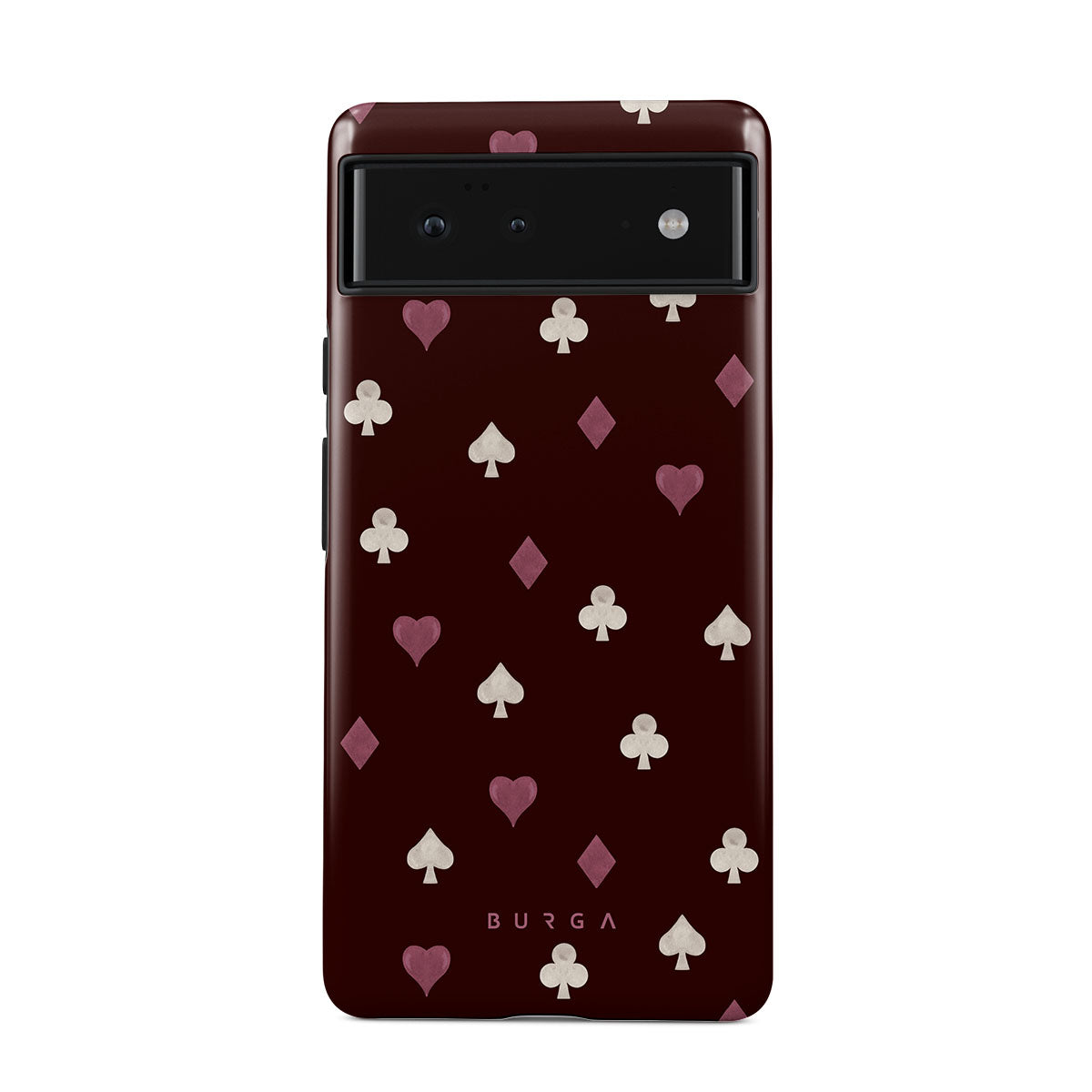 此設計特色: 撲克牌花色(紅心、黑桃、方塊、梅花)、酒紅色背景