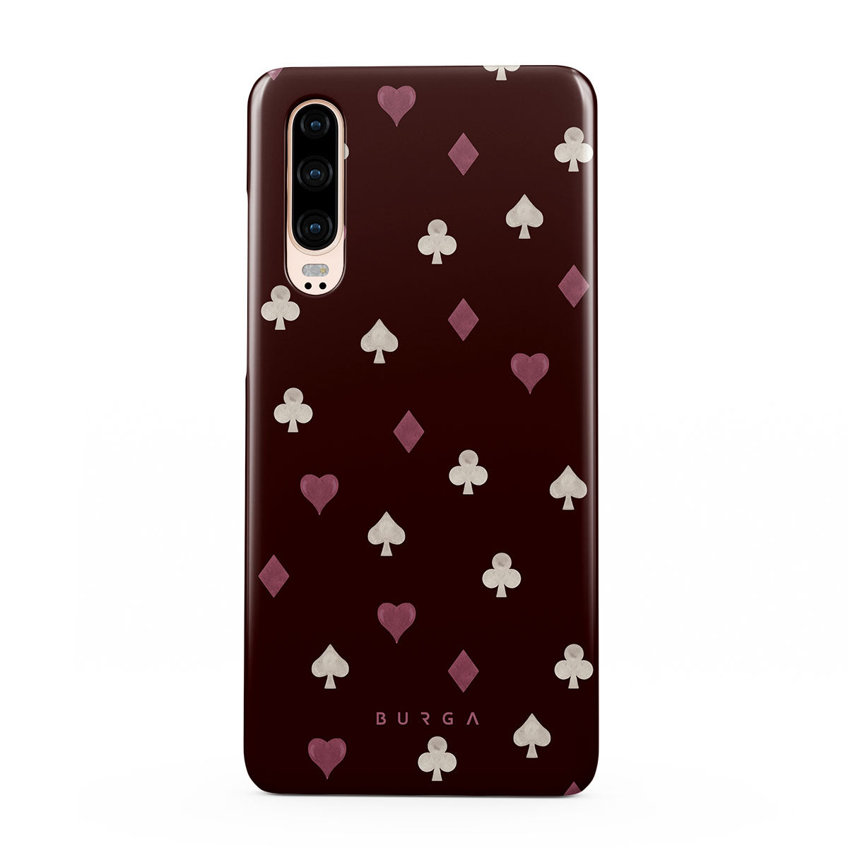 此設計特色: 撲克牌花色(紅心、黑桃、方塊、梅花)、酒紅色背景