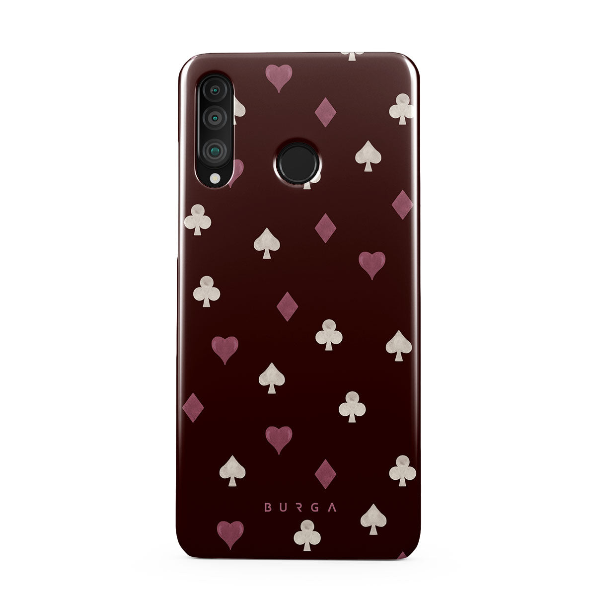 此設計特色: 撲克牌花色(紅心、黑桃、方塊、梅花)、酒紅色背景