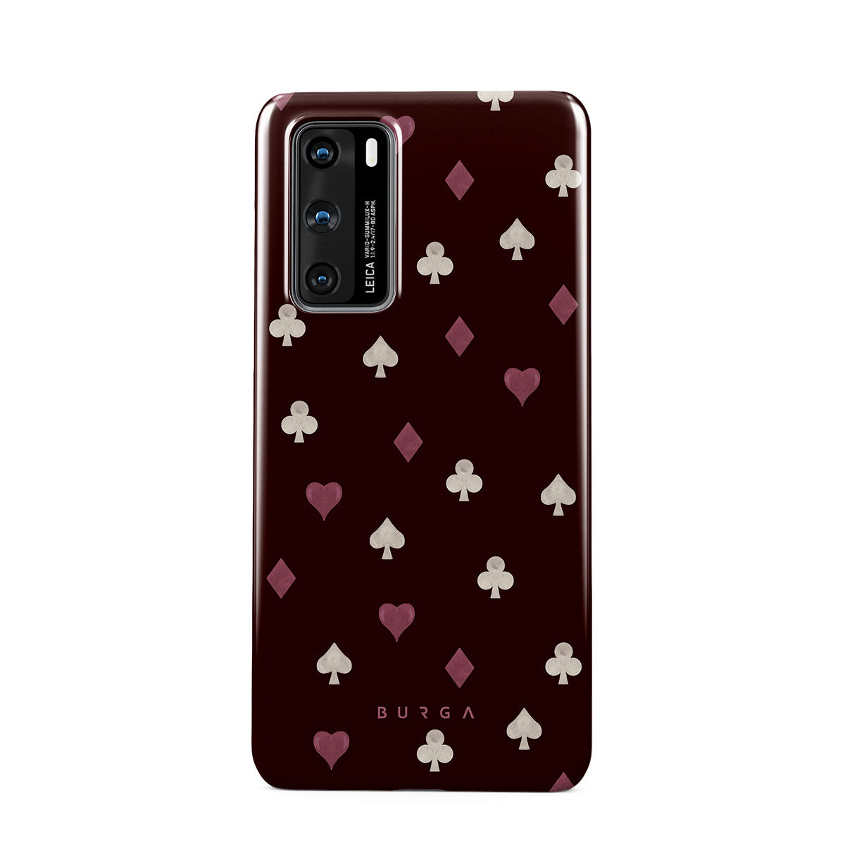 此設計特色: 撲克牌花色(紅心、黑桃、方塊、梅花)、酒紅色背景