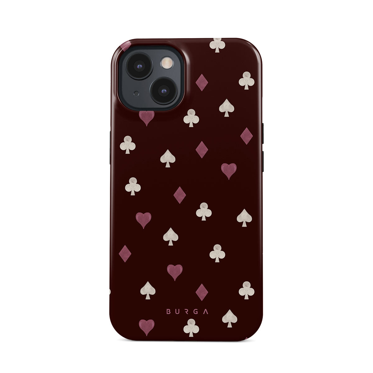 此設計特色: 撲克牌花色(紅心、黑桃、方塊、梅花)、酒紅色背景