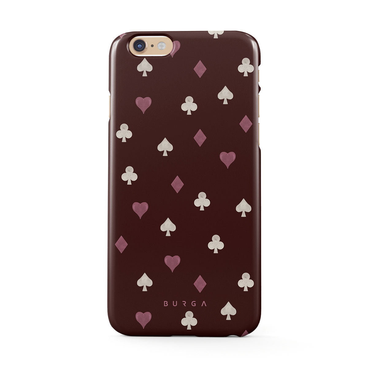 此設計特色: 撲克牌花色(紅心、黑桃、方塊、梅花)、酒紅色背景