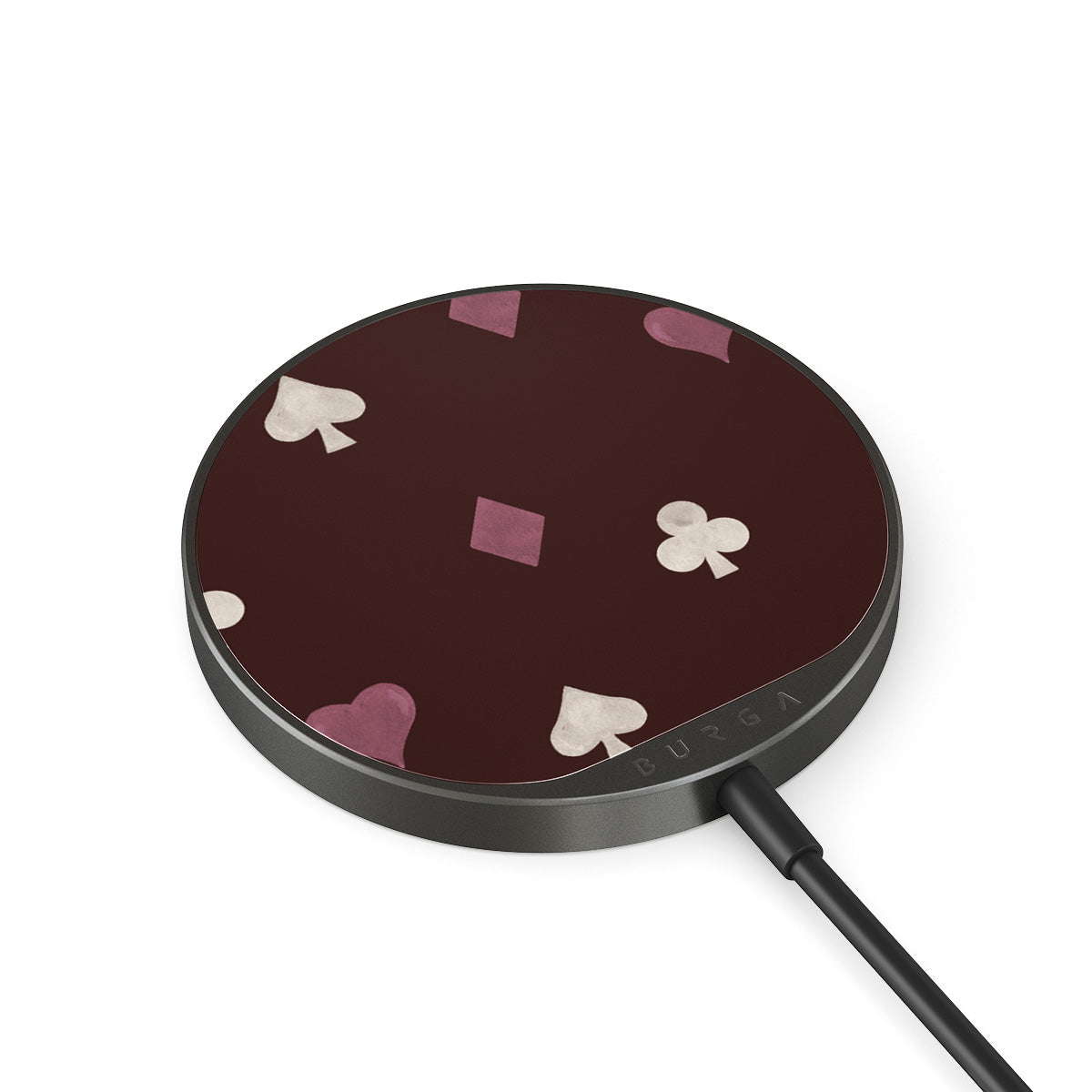 此設計特色: 撲克牌花色(紅心、黑桃、方塊、梅花)、酒紅色背景