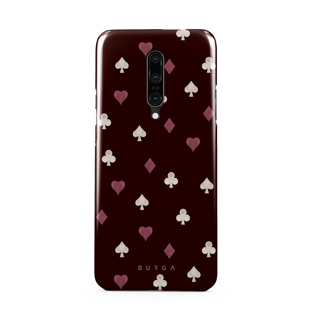 此設計特色: 撲克牌花色(紅心、黑桃、方塊、梅花)、酒紅色背景