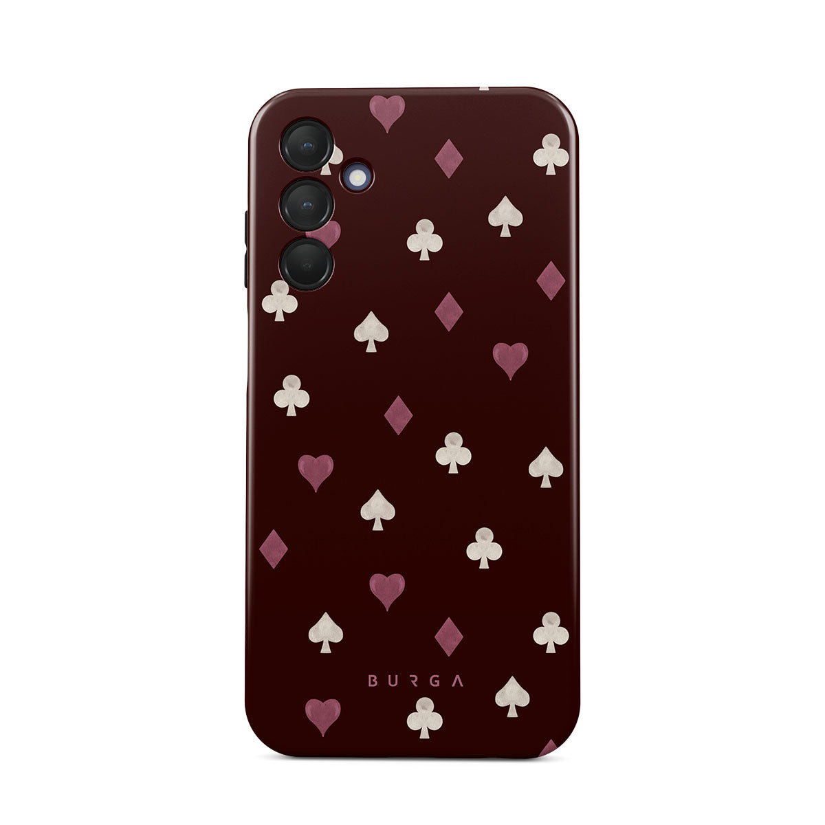 此設計特色: 撲克牌花色(紅心、黑桃、方塊、梅花)、酒紅色背景
