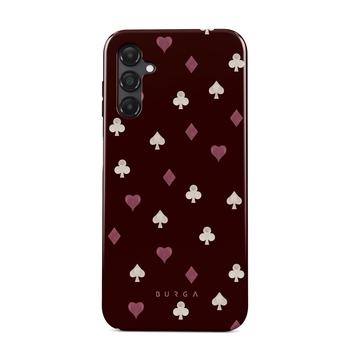 此設計特色: 撲克牌花色(紅心、黑桃、方塊、梅花)、酒紅色背景