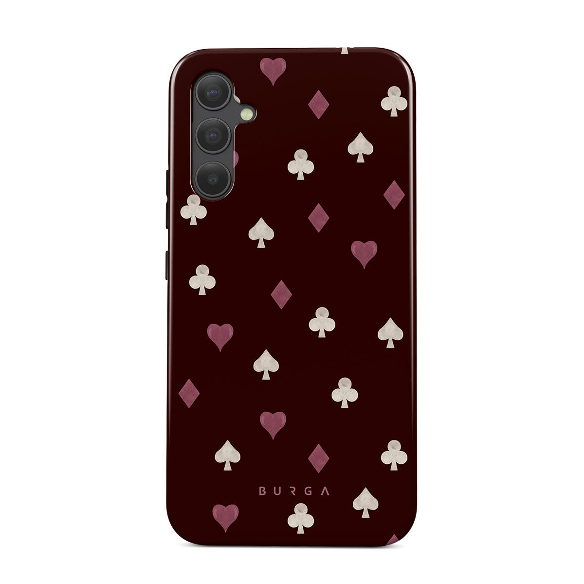 此設計特色: 撲克牌花色(紅心、黑桃、方塊、梅花)、酒紅色背景