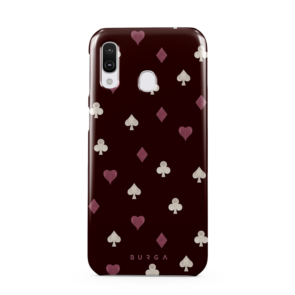 此設計特色: 撲克牌花色(紅心、黑桃、方塊、梅花)、酒紅色背景