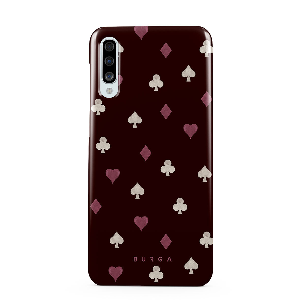 此設計特色: 撲克牌花色(紅心、黑桃、方塊、梅花)、酒紅色背景