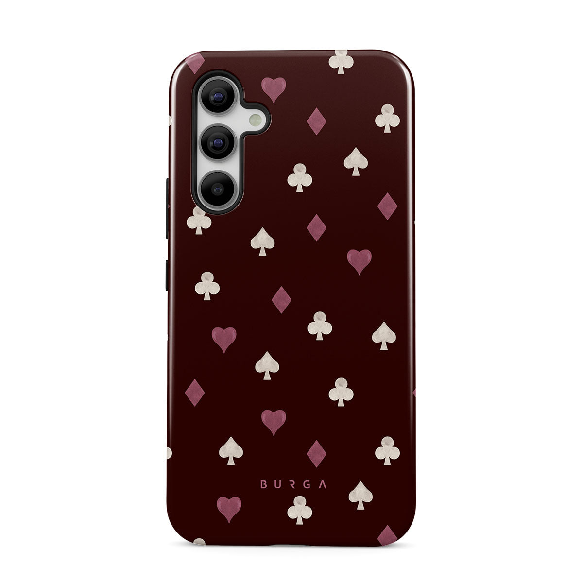 此設計特色: 撲克牌花色(紅心、黑桃、方塊、梅花)、酒紅色背景