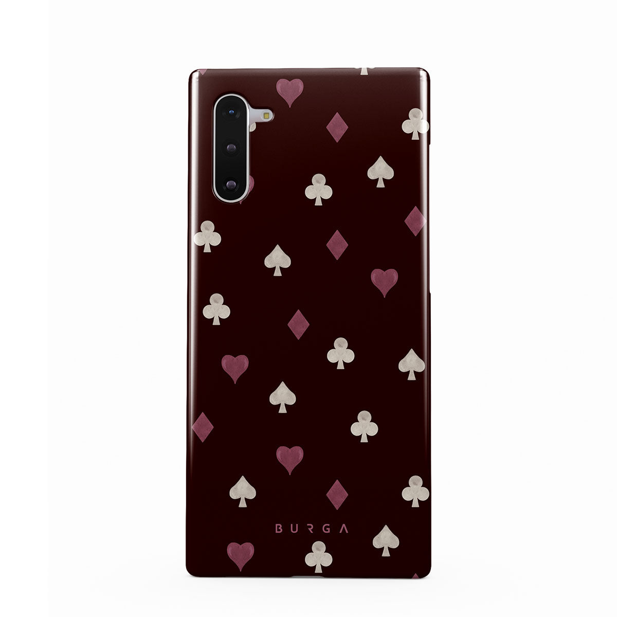 此設計特色: 撲克牌花色(紅心、黑桃、方塊、梅花)、酒紅色背景