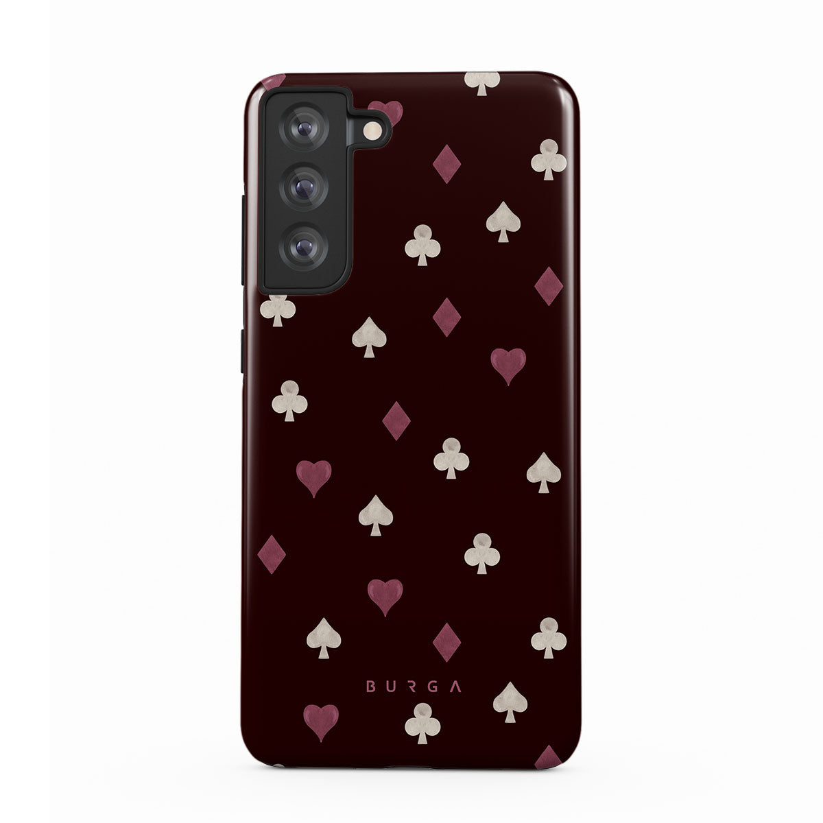 此設計特色: 撲克牌花色(紅心、黑桃、方塊、梅花)、酒紅色背景