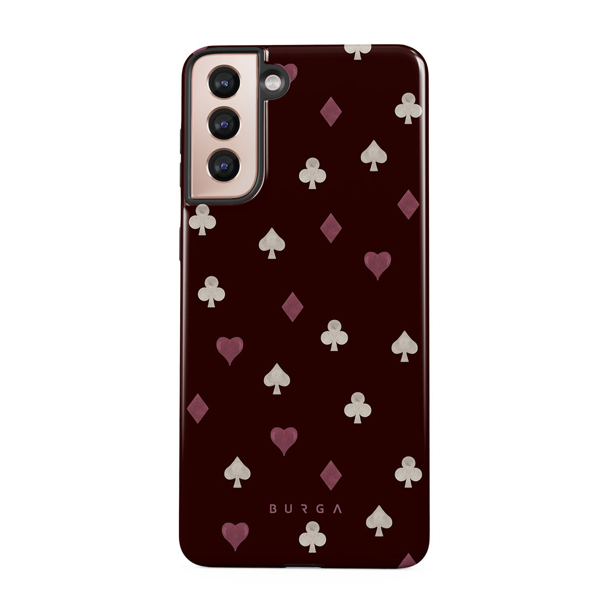 此設計特色: 撲克牌花色(紅心、黑桃、方塊、梅花)、酒紅色背景