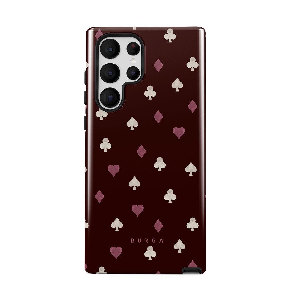 此設計特色: 撲克牌花色(紅心、黑桃、方塊、梅花)、酒紅色背景