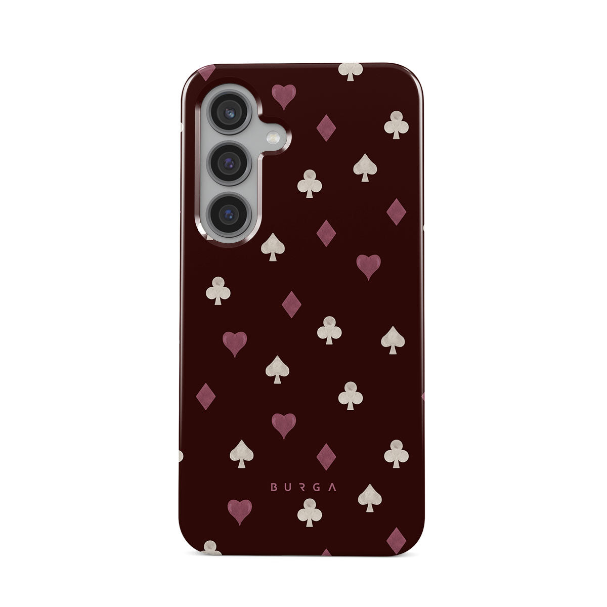 此設計特色: 撲克牌花色(紅心、黑桃、方塊、梅花)、酒紅色背景