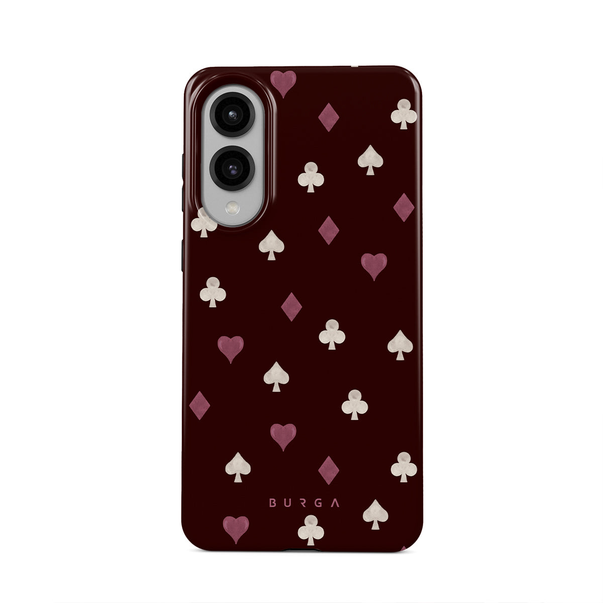 此設計特色: 撲克牌花色(紅心、黑桃、方塊、梅花)、酒紅色背景