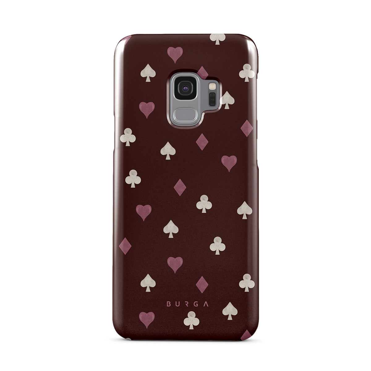 此設計特色: 撲克牌花色(紅心、黑桃、方塊、梅花)、酒紅色背景