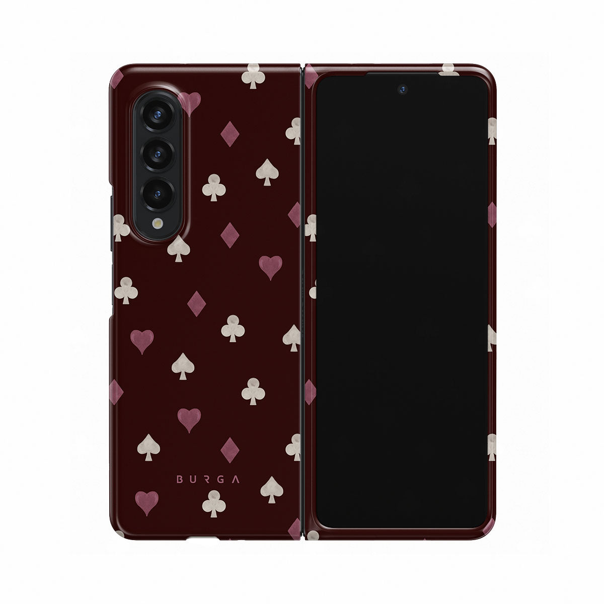 此設計特色: 撲克牌花色(紅心、黑桃、方塊、梅花)、酒紅色背景