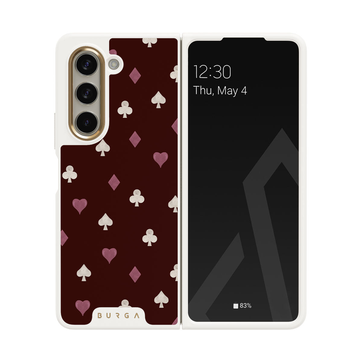 此設計特色: 撲克牌花色(紅心、黑桃、方塊、梅花)、酒紅色背景