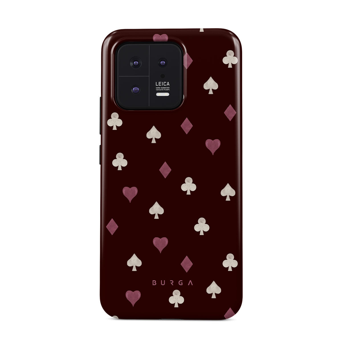 此設計特色: 撲克牌花色(紅心、黑桃、方塊、梅花)、酒紅色背景