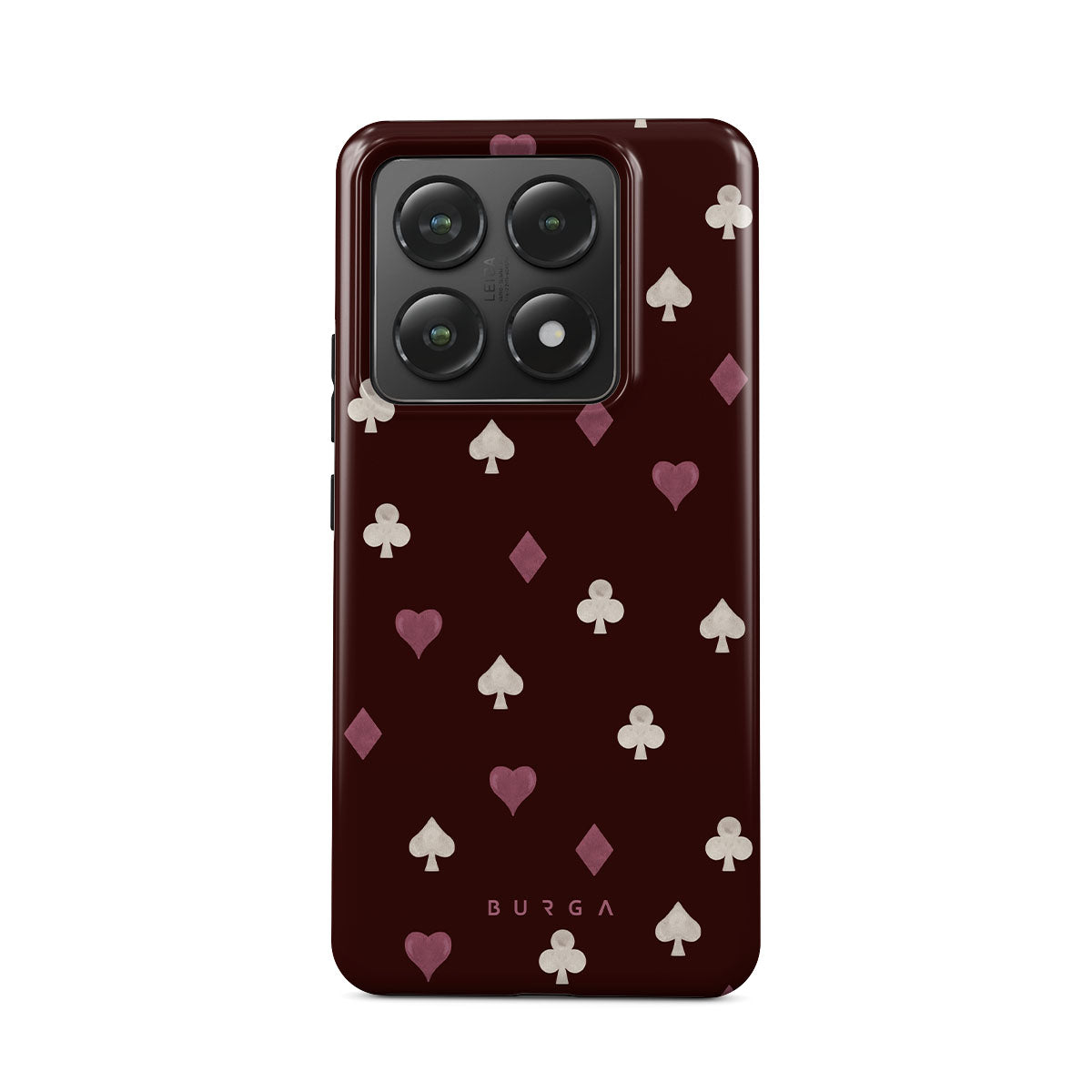 此設計特色: 撲克牌花色(紅心、黑桃、方塊、梅花)、酒紅色背景