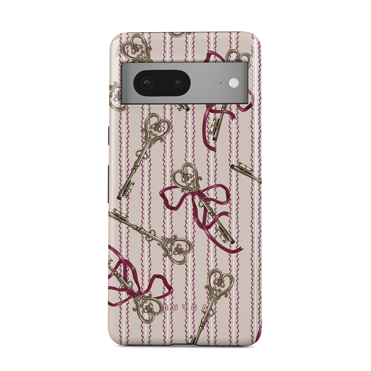 此設計特色: 古董鑰匙、蝴蝶結、粉色絲帶、條紋背景