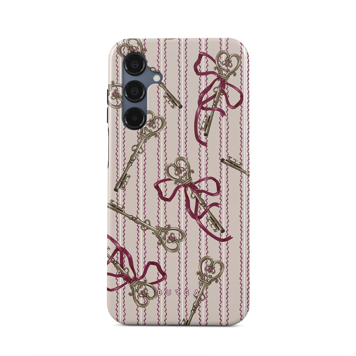 此設計特色: 古董鑰匙、蝴蝶結、粉色絲帶、條紋背景