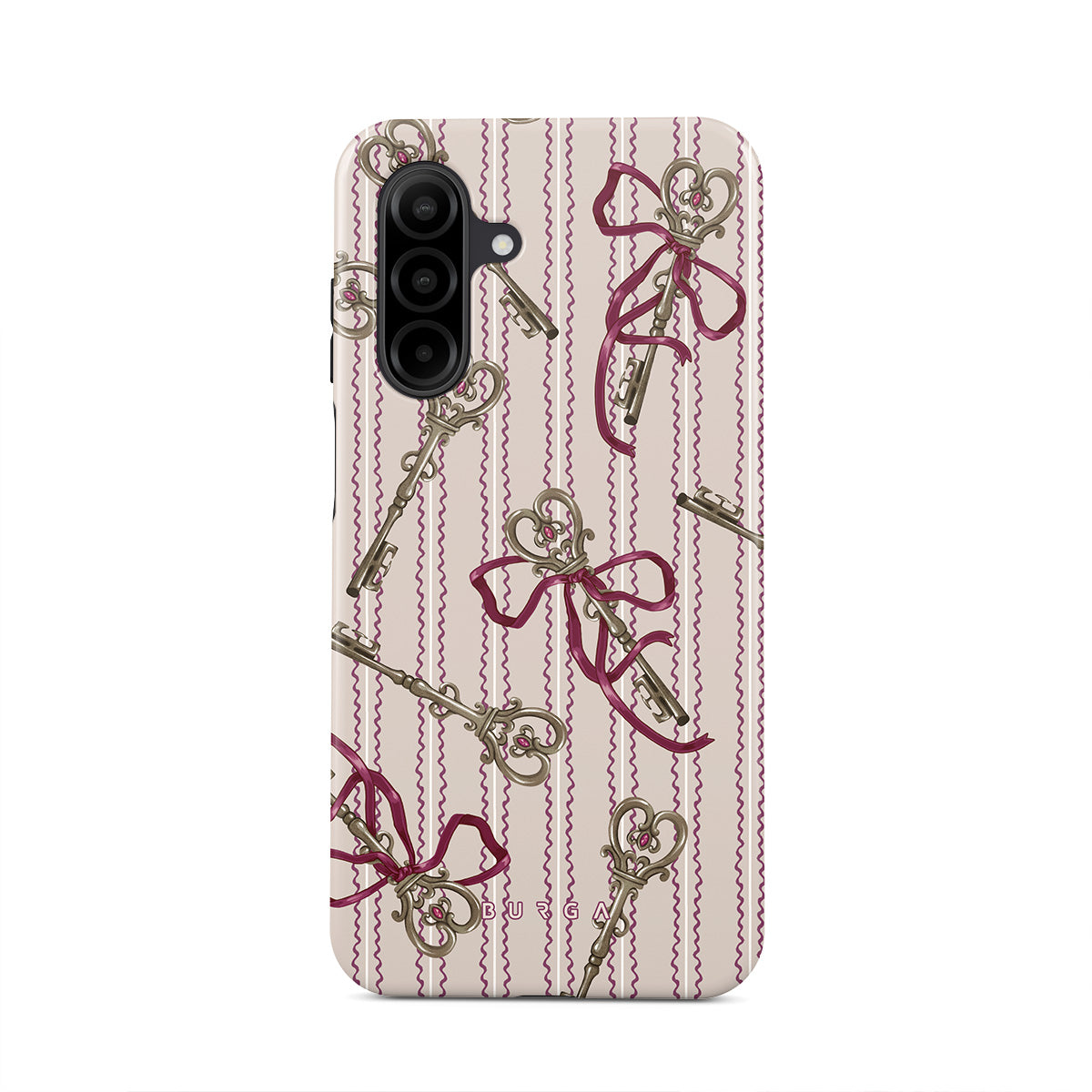 此設計特色: 古董鑰匙、蝴蝶結、粉色絲帶、條紋背景