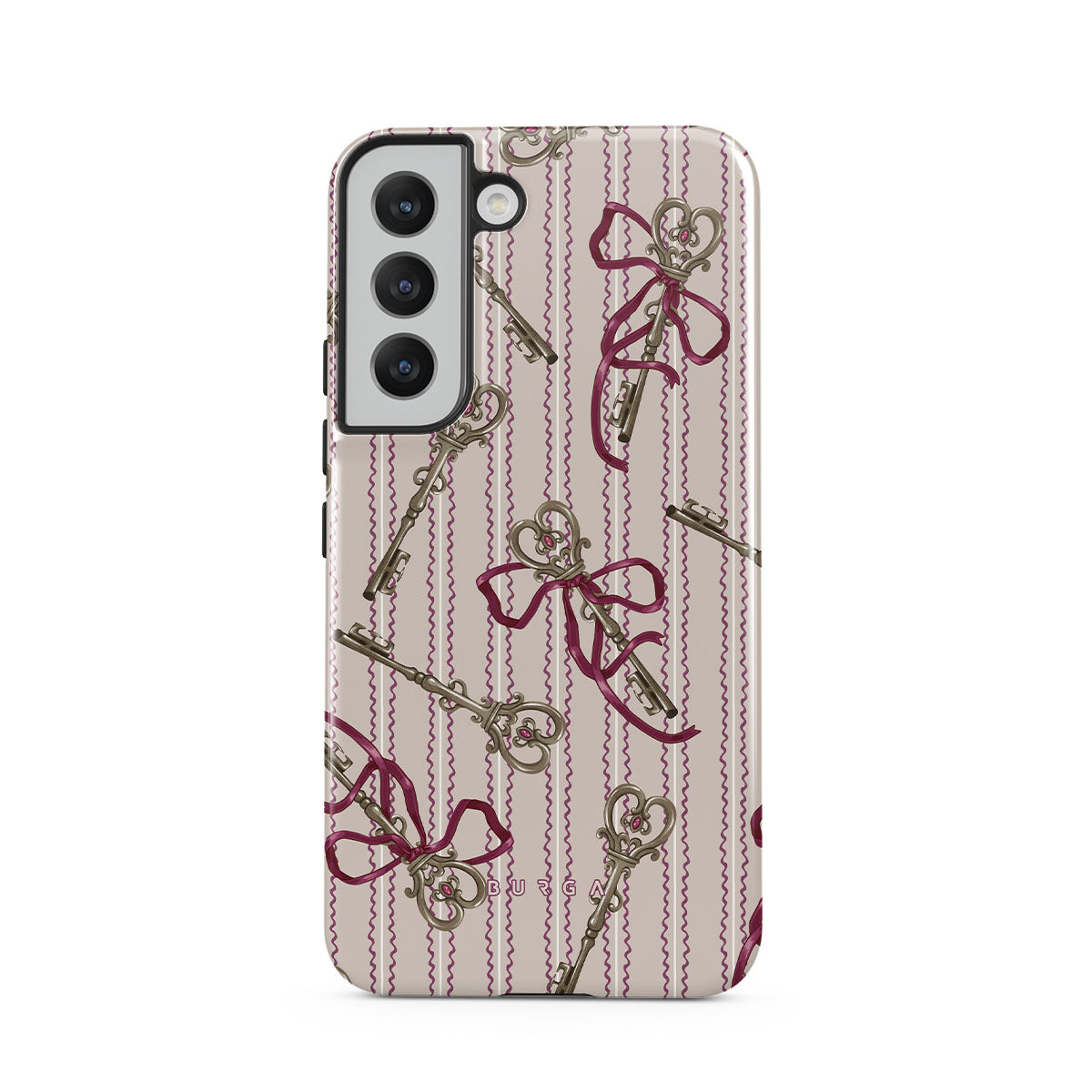 此設計特色: 古董鑰匙、蝴蝶結、粉色絲帶、條紋背景