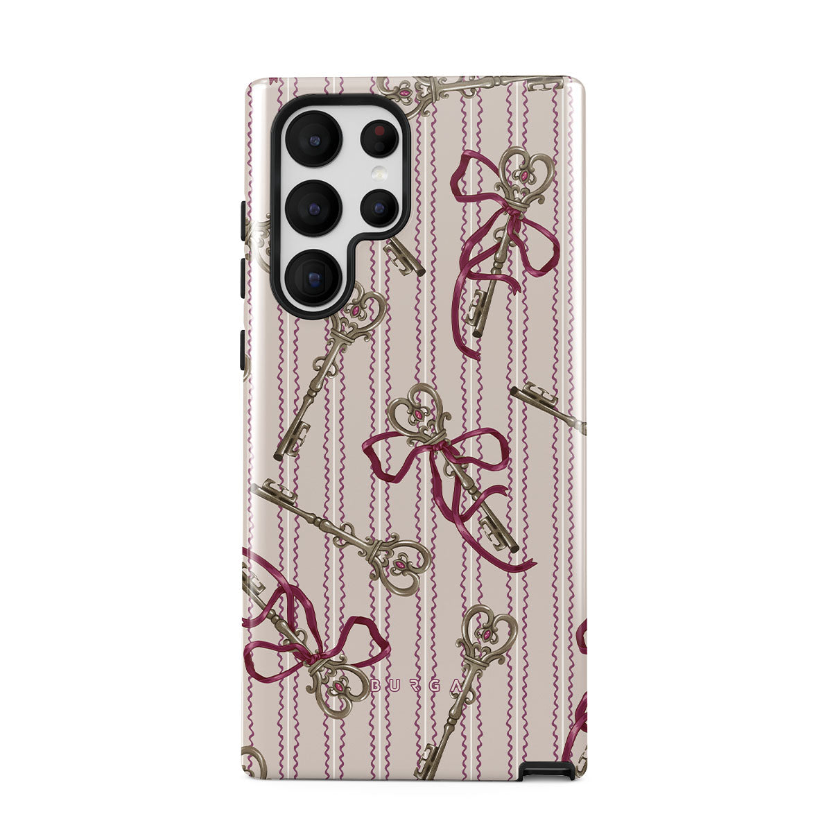 此設計特色: 古董鑰匙、蝴蝶結、粉色絲帶、條紋背景