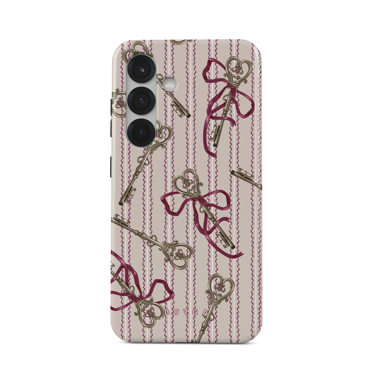 此設計特色: 古董鑰匙、蝴蝶結、粉色絲帶、條紋背景