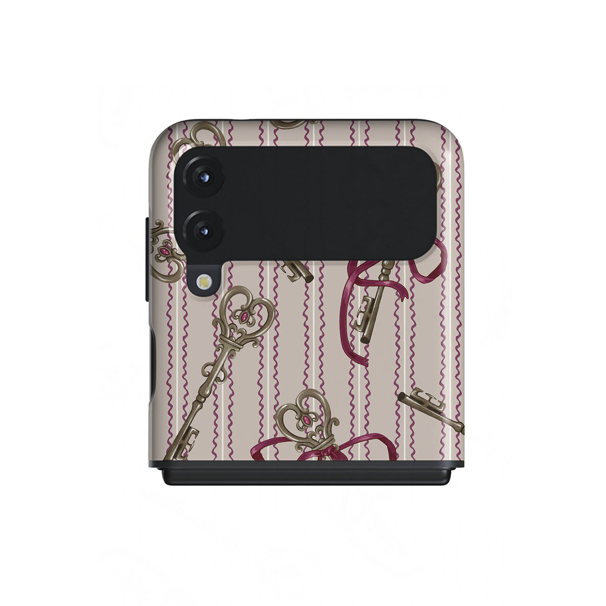 此設計特色: 古董鑰匙、蝴蝶結、粉色絲帶、條紋背景