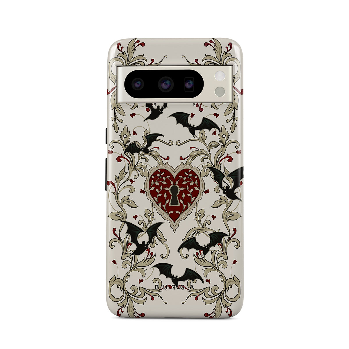 此設計特色:心形、鎖頭、蝙蝠、哥特風格圖案
